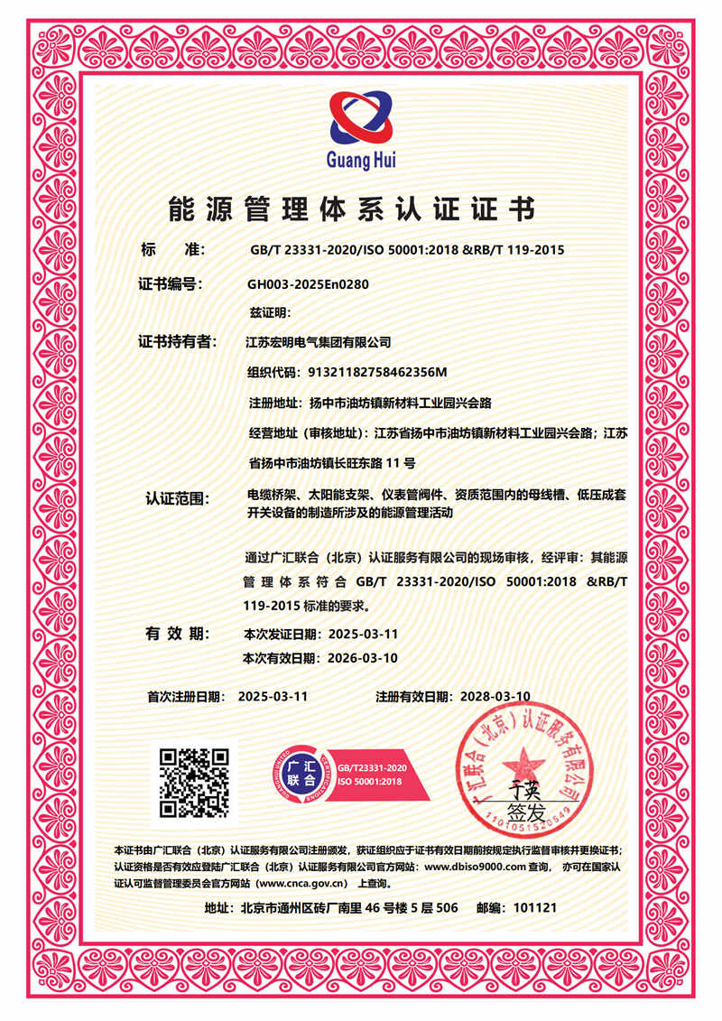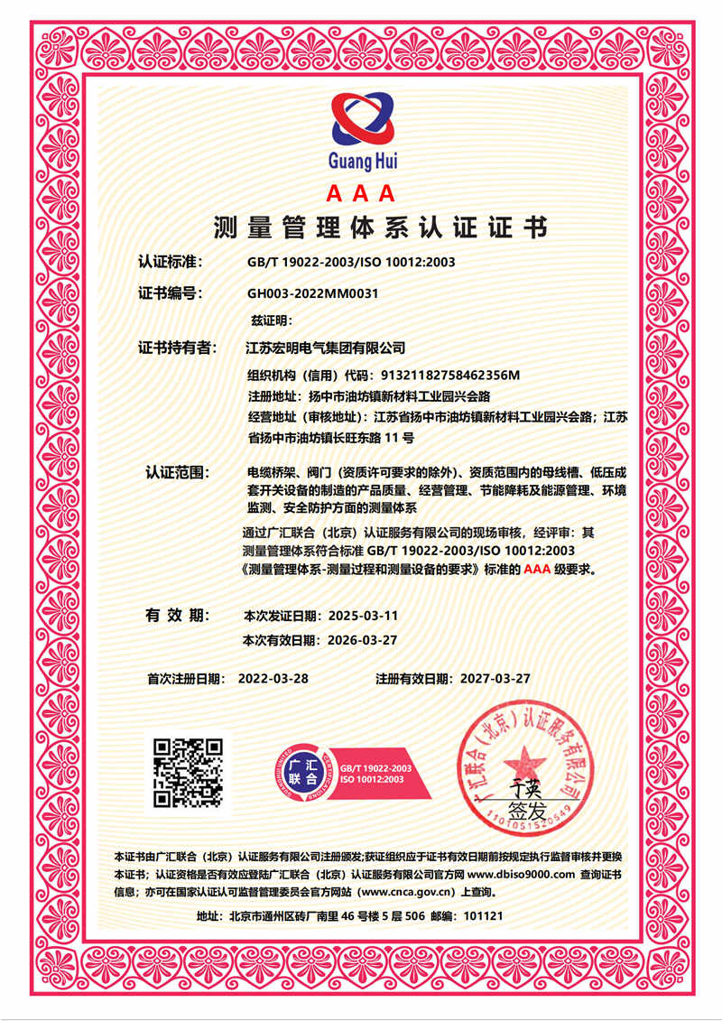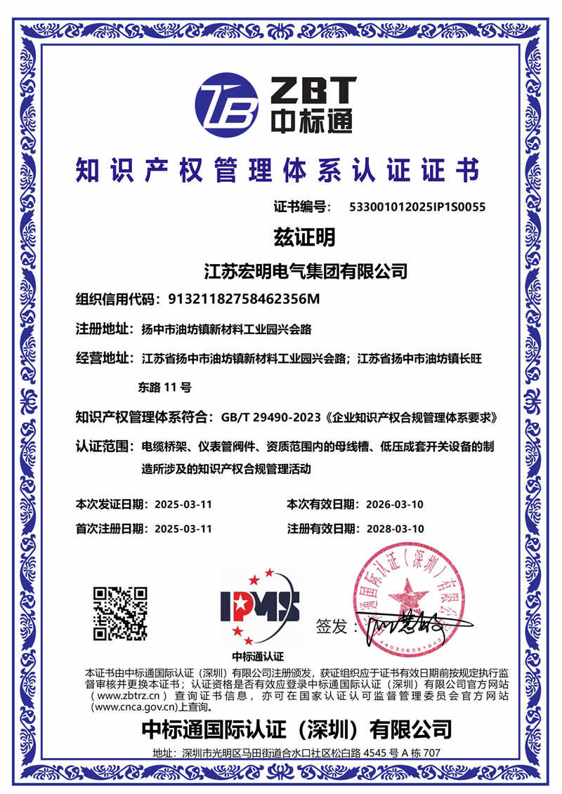 公司先后通过ISO9001、ISO14001、ISO45001等国际标准化管理体系认证。生产的母线槽、高低压开关设备系列产品已通过中国强制性产品认证。公司已注册的 “旺耀”“宏明”牌系列产品先后为国内320多个重点工程配套选用。